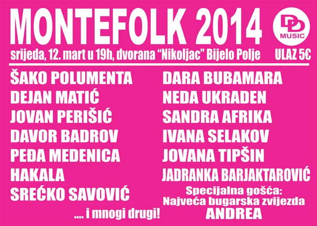 - Na ovom najvećem muzičkom spektaklu u Crnoj Gori nastupiće Neda Ukraden, Jovan Perišić, Dejan Matić, Dara Bubamara, Jadranka Barjaktarović, Davor Badrov, Šako Polumenta, Andrea i mnogi drugi. Prodaja karata za „Montefolk“ biće organizovana na gradskom trgu u Bijelom Polju 12. marta od 10 časova, i ispred dvorane „Nikoljac“ od 16 časova. Cijena ulaznice je pet, a VIP ulaznica koštaće 10 eura, kažu organizatori.