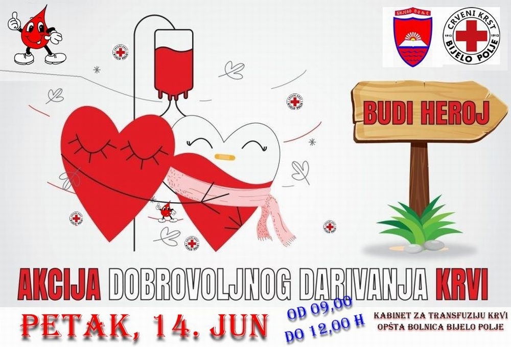 Povodom Svjetskog dana dobrovoljnih davalaca krvi, u petak 14. juna, od 9 - 12 h u prostorijama Kabineta za transfuziju krvi Opšte bolnice u Bijelom Polju će se održati akcija dobrovoljnog davanja krvi.